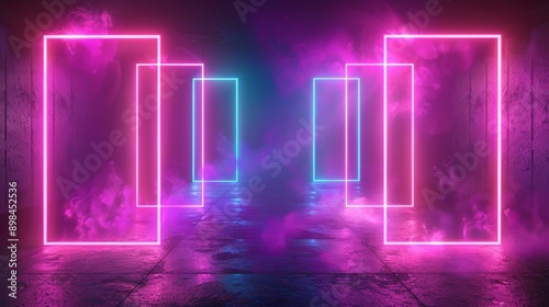 Pink and blue neon glowing frame lines tunnel in dark empty concrete grunge room background