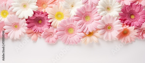 Pink and white flowers neatly arranged in a line on a clean white tabletop