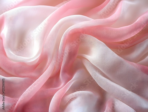 Pink and White Silk Fabric Texture: Delicate blush pink and ivory silk fabric, softly draped in luxurious folds, creates an elegant and romantic texture.