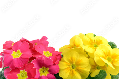 pink and yellow primrose flower frame. copyspace. isolated on wh