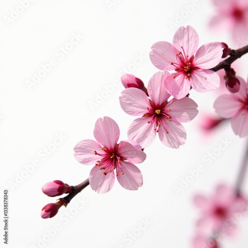 Pink cherry blossom branch, tilted, isolated on white Spring floral background , bloom, aesthetic, Japanese