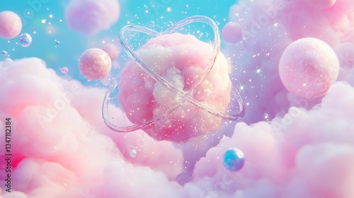 Pink Cloud Orbiting Sphere in Pastel Sky