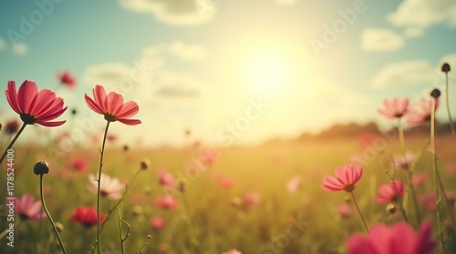 Pink Cosmos Flowers in a Field at Sunset, Soft Focus, Warm Light, Dreamy Atmosphere