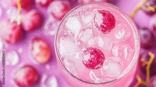 Pink drink with sparkling water, fresh grapes, and ice cubes in a glass, capturing the essence of a refreshing summer beverage.