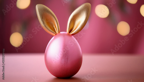 Pink Easter egg with luxurious golden bunny ears. Happy holiday. Spring season.
