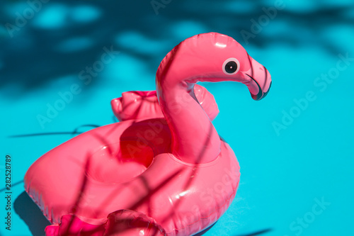 Pink flamingo swim ring drink holder on turquoise background with shadows of exotic plants.