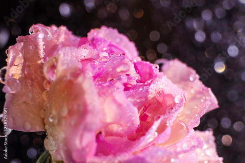 Pink flower closeup. Petals in drops of water. Beautiful summer image.