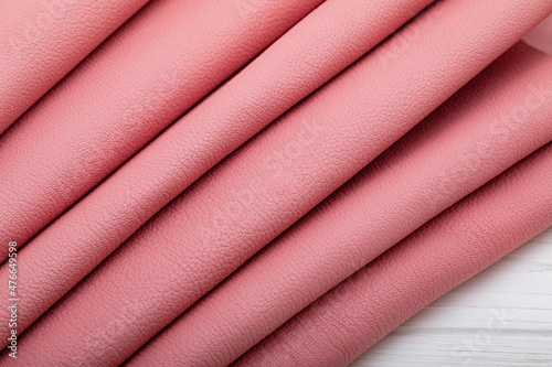 Pink folded natural cow leather on the wooden table