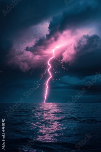 pink glowing lightning bolt striking the dark blue sea from cloudy sky