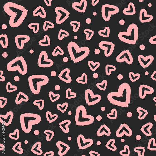 Pink hearts and dots randomly scattered on a black background. Seamless pattern. Grunge, sketch, graffiti, rough brush.