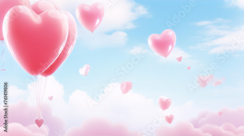 Pink heart-shaped balloons floating in a blue sky with white clouds.
