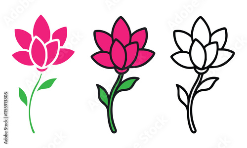 Pink Lotus Flower with Outline Variations, Vector illustration set of a pink lotus flower with green leaves, including a black-and-white outline version for coloring and design projects.