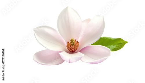 Pink magnolia blossom with green leaves isolated on transparent background