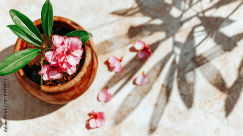 Pink oleander flower in a terracotta pot with fallen petals, symbolizing fragility, loss, and emotional distress