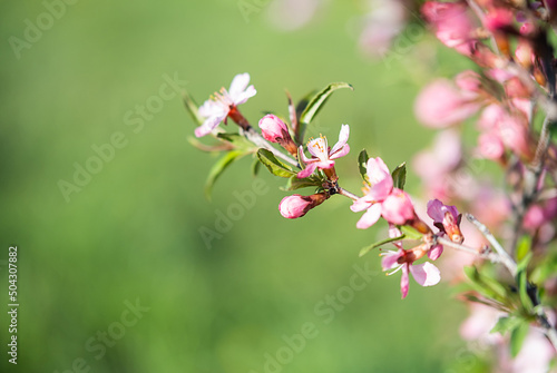 Pink ornamental almond flowers, close up. Natural spring background, selective focus.
