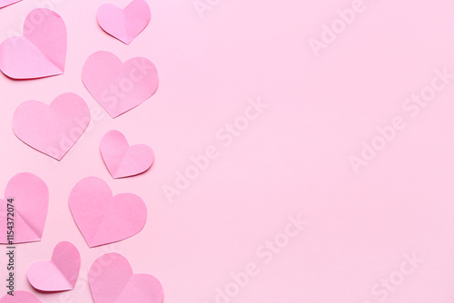 Pink paper hearts on color background. Valentine's Day celebration