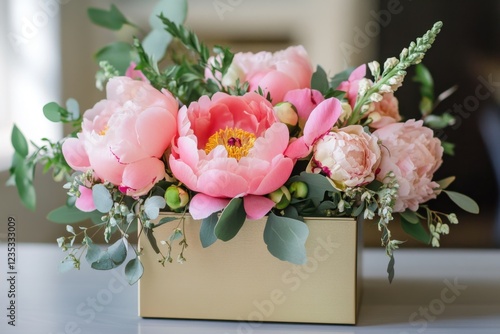 Pink peonies and greenery in a gold box arrangement