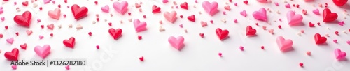 Pink, red, and white heart sprinkles on a white background, texture, sweet treat