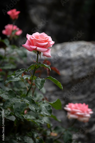 Pink Rose Blooming Against Stone Background in Korea Garden