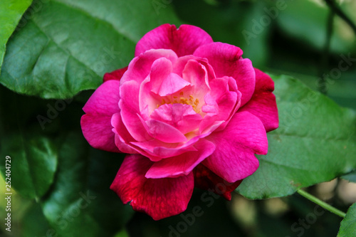 Pink rose with green leafs