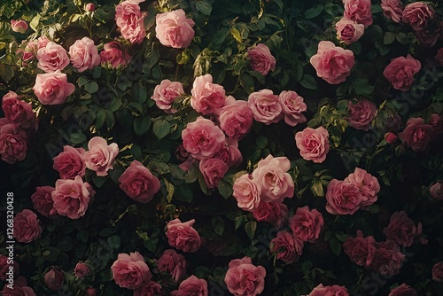 Pink Roses Bloom Abundantly in Lush Garden, Creating Romantic Atmosphere with Vibrant Petals