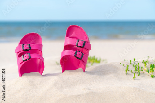 Pink sandals at the beach on a beautiful sunny day. Slippers in the sand by the sea. Flip flops at the shore by the ocean.