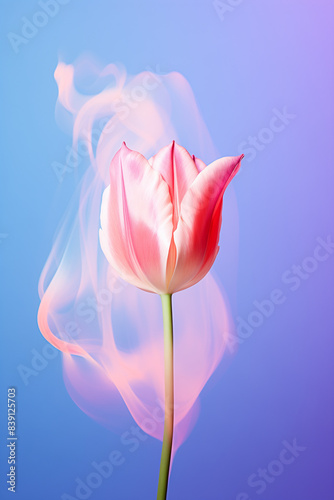 Pink tulip with smoke on blue purple background. Minimal concept.
