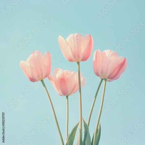 Pink tulips against a light blue sky background in high definition photography photos with delicate details and high resolution. generative ai