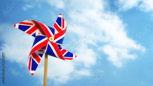 Pinwheel with UK flag theme against blue sky.