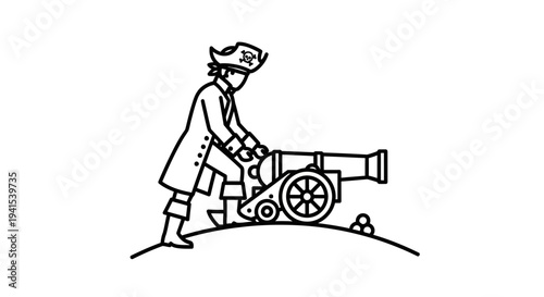 Pirate aiming cannon, historical illustration, maritime warfare, adventure, old ship weapon