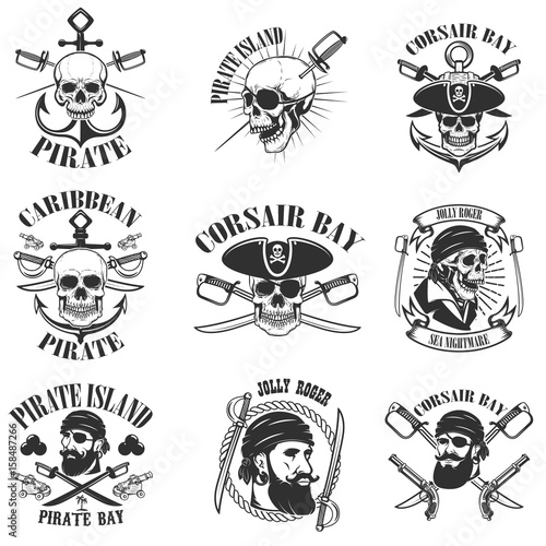 pirate emblems onwhite background. Corsair skulls, weapon, swords,guns. Design elements for logo, label, emblem, sign, poster, t-shirt. Vector illustration
