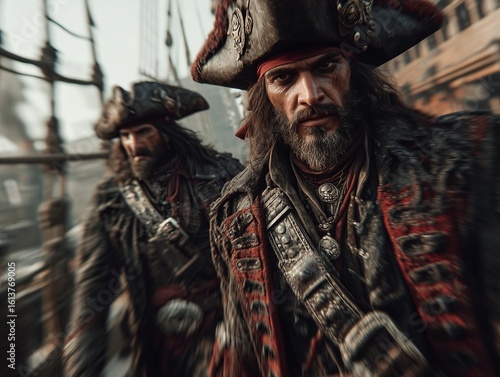 Pirates in elaborate costumes walk on a ship deck, exuding a sense of adventure and historical intrigue. Image captures the essence of swashbuckling and maritime lore.