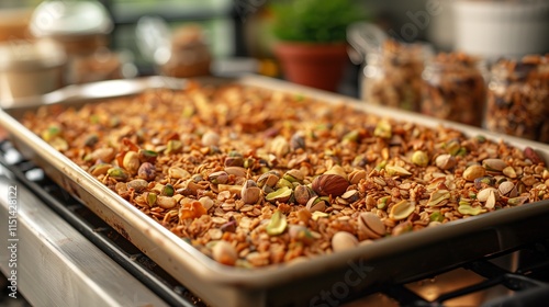 Pistachio granola clusters arranged on a baking sheet, freshly baked and captured in HD for a crunchy breakfast option