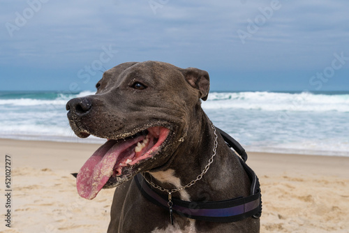 Pit Bull dog playing on the beach. Having fun with the ball and digging a hole in the sand. Partly cloudy day. Selective focus