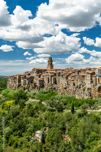 Pitigliano town buildings standing on a volcanic cliff in Tuscany