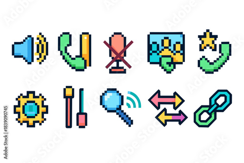 Pixel art icon set. Communication, technology, search and tools pixelated collection