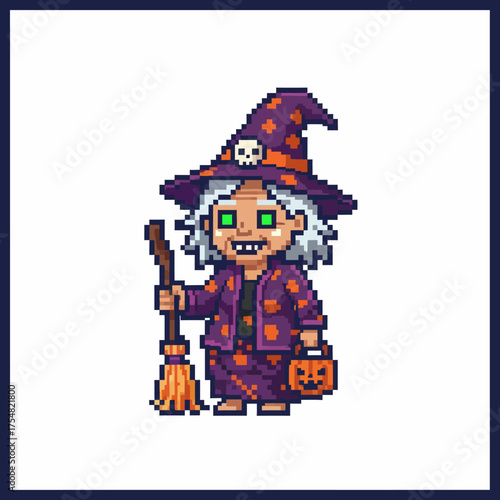 Pixel art of a witch with a broom and pumpkin bucket.