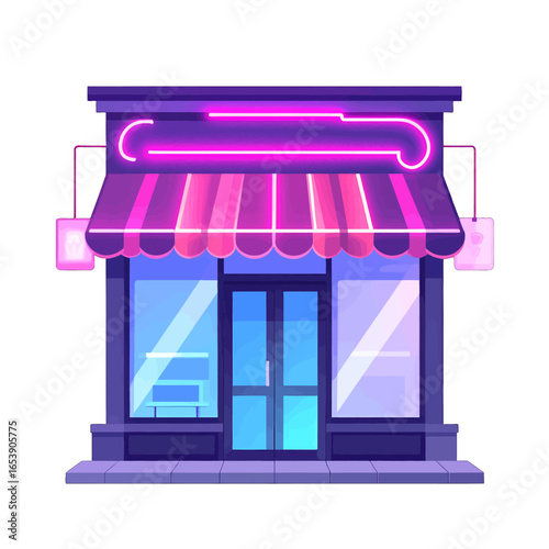 Pixel Art Style Storefront with Neon Sign and Awning in Purple and Pink Hues Against a White Background