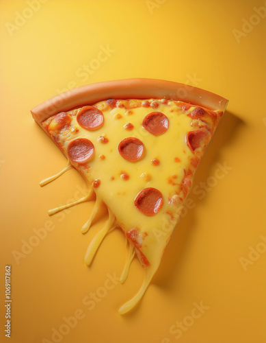 pizza slice with melted cheese, isolated on a yellow pastel