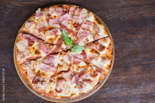 pizza with bacon ham and sausage on wooden table, Top view