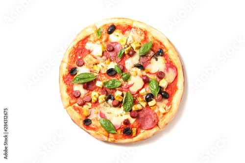 Pizza with sausage, meat, cheese, basil and olives isolated on white background