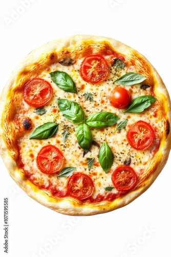 Pizza with tomatoes, basil, and cheese.