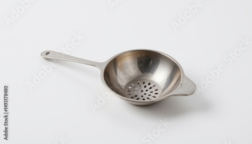 plain stainless steel tea infuser, round or spoon style, no logo or branding, isolated on white background, centered, soft light, hyper clean 8k image detail.