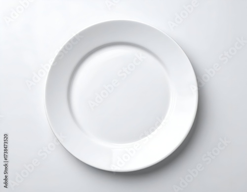 Plain, white, ceramic dinner plate, photographed directly from above, on a white surface