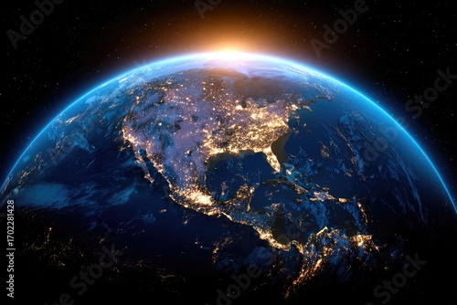 Planet Earth From Space Sunrise Over North America Illuminated Cities.