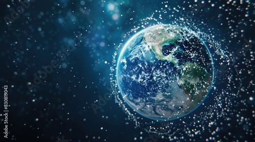 Planet Earth, seamlessly integrated into a futuristic data hologram screen against a dark blue background, creating a high-tech digital interface that showcases the world's geography from space.