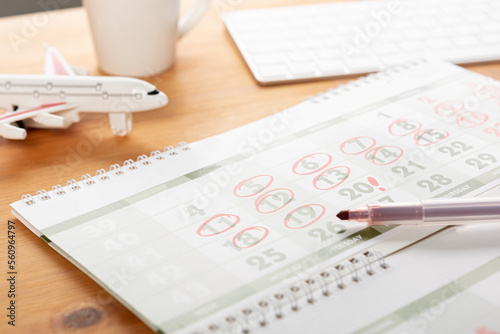 Planner Calendar and agenda reminders, work from home. for plan daily meeting and note holiday trip in diary at office desk. 2023 calendar reminder concept.