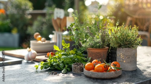 Plants and oranges on table outside.