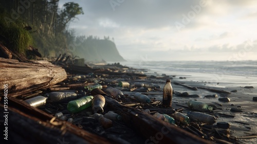 Plastic Bottles Scattered on Driftwood-Lined Beach at Low Tide — Pollution Scene