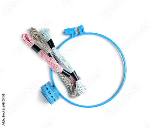 Plastic embroidery hoop with moulin threads isolated on white background